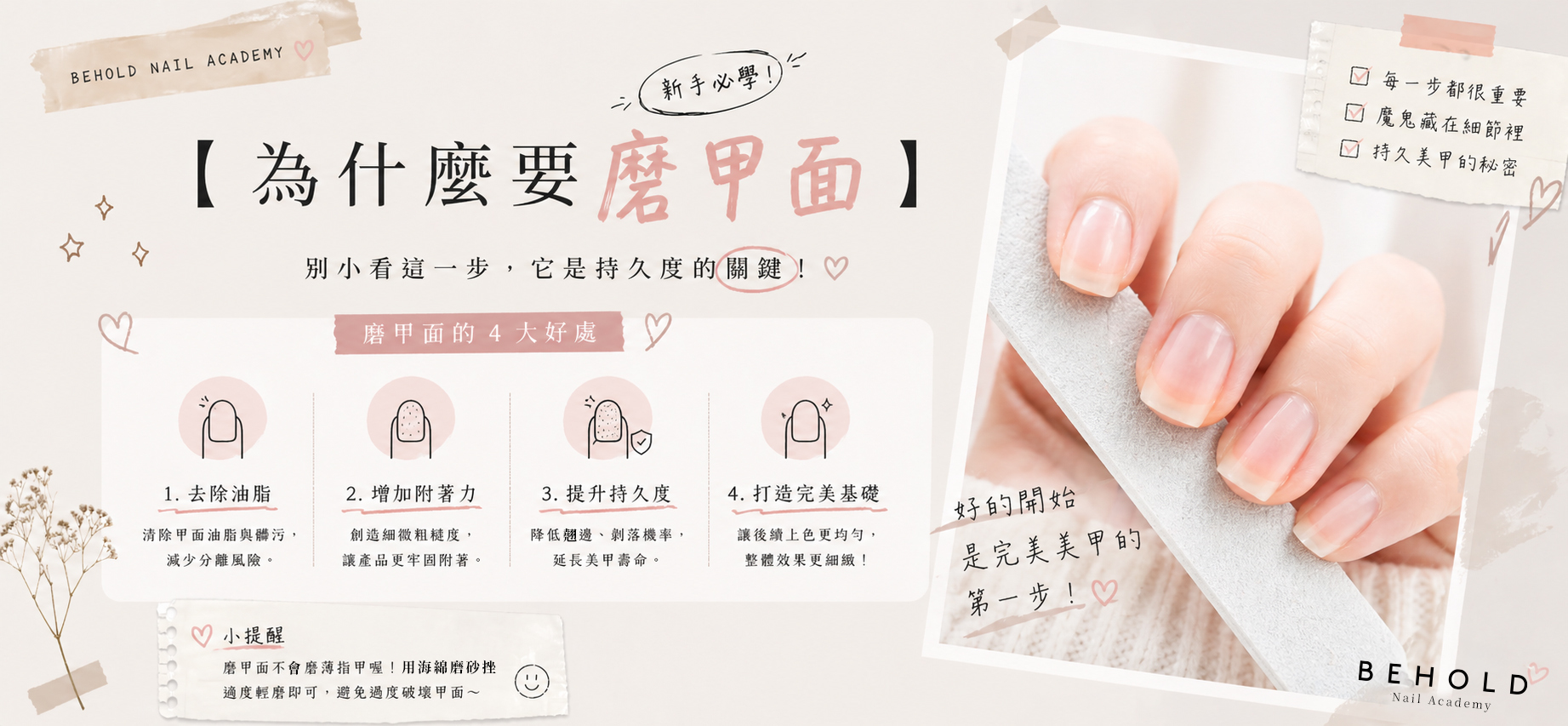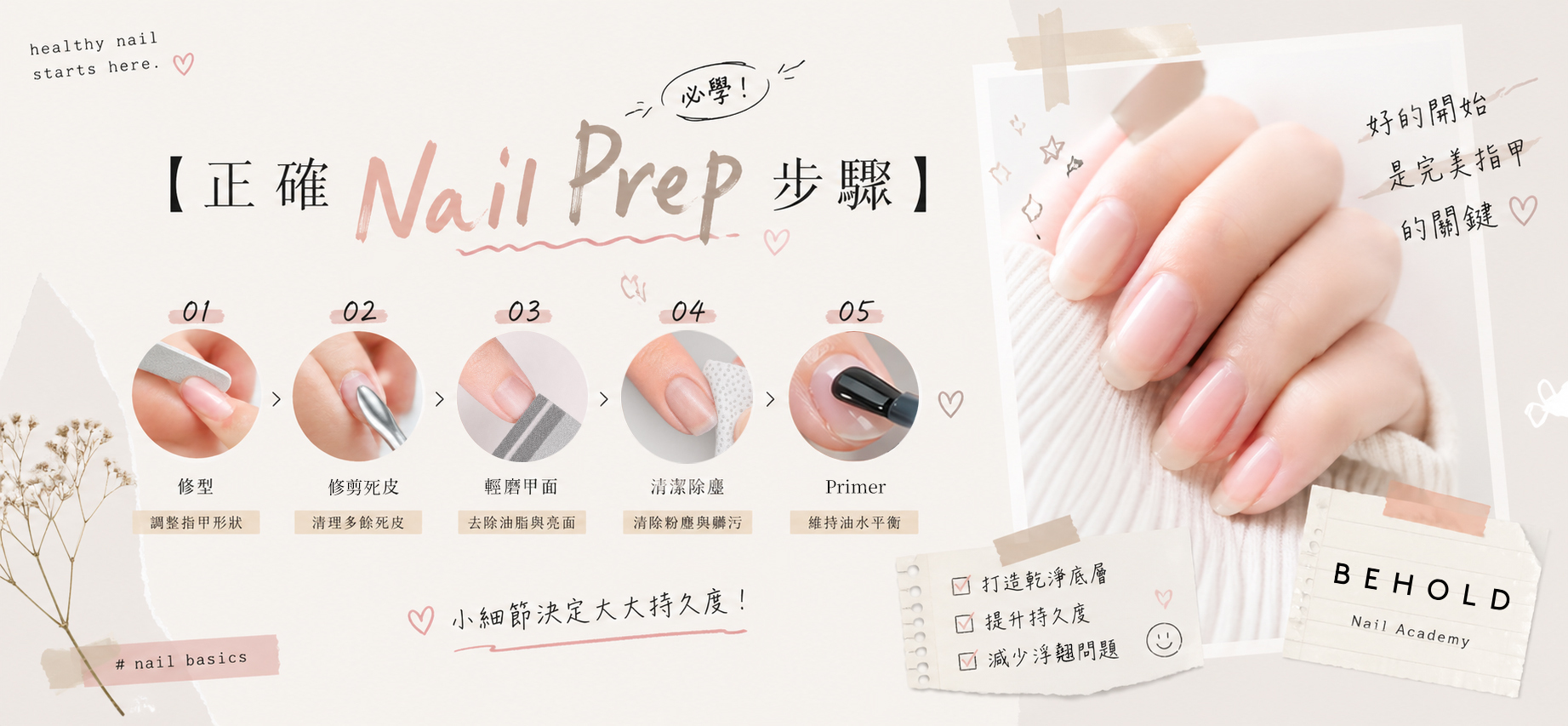 🔍 問題明明跟足教程上膠、照燈,但 gel nail 就是做不好、不是起翹就是甲面不平?其實問題大多不在上膠,而是在上膠之前——Nail Prep 做得好,後面所有步驟事半功倍。💡 原因很多人急著上膠,把 prep 步驟草草了事甚至完全跳過。但甲面上的油脂、水分、死皮,會直接阻礙 gel 的附著力,讓所有後續步驟都白費。✅ 正確 Nail Prep 完整步驟Step 1:洗手 做甲前先徹底洗淨雙手,去除表面污垢,但洗完要等雙手完全乾透再開始,水分殘留同樣影響附著力。Step 2:修甲形 用銼甲棒把甲形修整至你想要的形狀(方形、橢圓、杏仁形),同一方向銼,不要來回鋸,避免甲尖撕裂。Step 3:推甲皮 用木棒或不鏽鋼推皮棒,輕柔地把甲皮推向後方,讓甲面完全露出。甲皮推乾淨,Base Coat 才能真正貼住甲板。Step 4:修剪多餘甲皮 用甲皮剪輕輕剪去推起來的多餘死皮,動作要輕,不要剪到活組織,避免出血或發炎。Step 5:磨甲面 用 180 度細砂棒輕輕打磨整個甲面,讓甲板表面製造微細紋路,增加附著力。力度要輕,目的是「磨粗」不是「磨薄」。Step 6:清除粉塵 用乾淨的刷子(Dust Brush)把磨甲產生的粉塵掃走,確保甲面乾淨。Step 7:Primer 增強附著 上一層薄薄的 Primer,等待乾透後才上 Base Coat。Primer 是 gel 與甲板之間的「黏合橋樑」。💬 BEHOLD Tips: Prep 做好後,甲面看起來會呈現啞白色,代表油脂已徹底去除。如果仍然反光,建議再用 Primer 補一次。