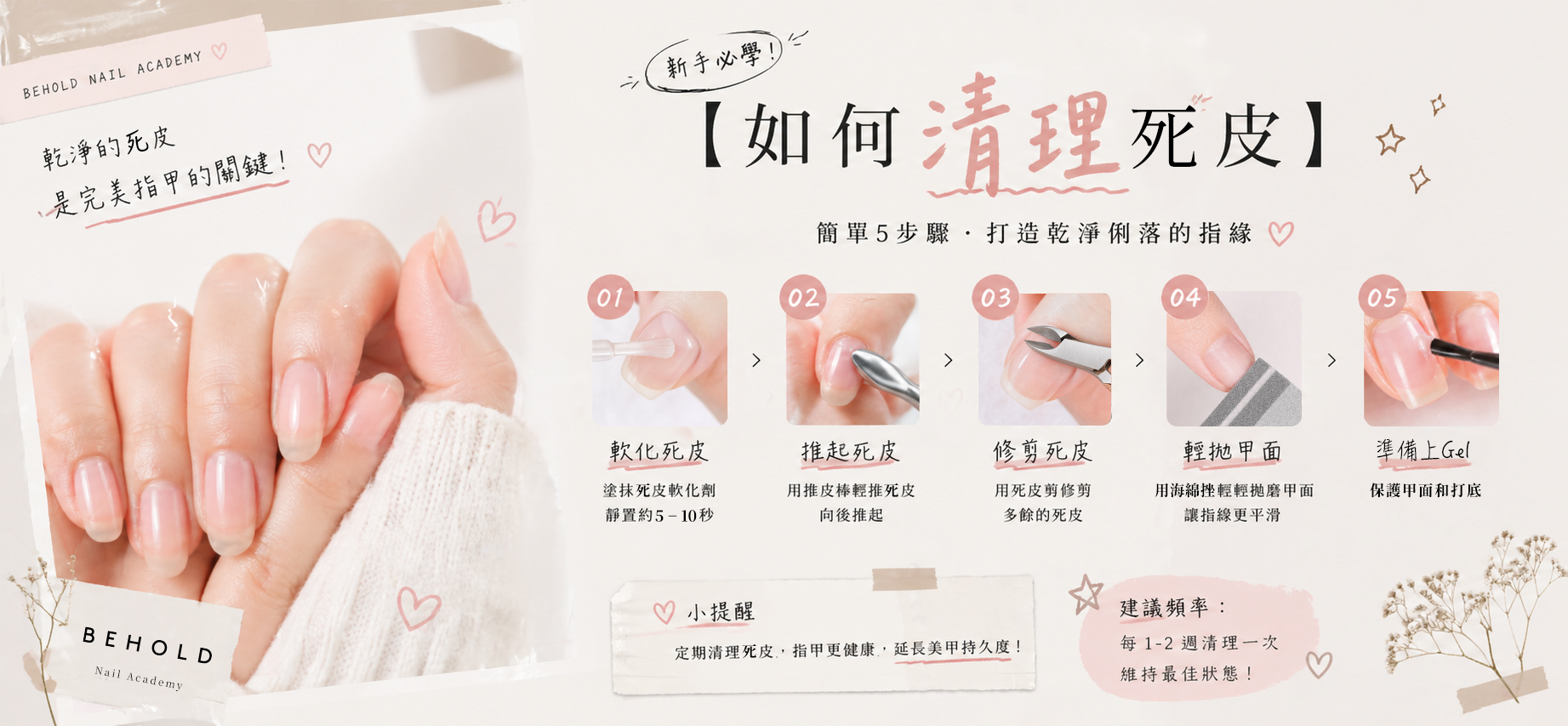 🔍 問題推死皮(甘皮)這個步驟,很多人不是跳過就是用錯方法——有人用力硬剪、有人推到出血,結果不但沒做好 prep,還弄傷了自己的手指。💡 原因死皮(Cuticle)是保護甲床的天然屏障,處理不當會導致甲皮撕裂、發炎,甚至引起甲溝炎。但如果不清理,甲皮殘留在甲面上,Base Coat 會直接塗在甲皮上,照燈後隨甲皮脫落,引起 Lifting。✅ 正確甘皮清理方法工具準備:木棒 / 不鏽鋼推皮棒甲皮軟化劑(Cuticle Remover)甲皮剪 / Nipper甲皮油Step 1:軟化死皮 在甲皮位置塗上少量甲皮軟化劑,靜待 1-2 分鐘,讓甲皮變軟,之後推起來更輕鬆,也不容易撕裂。Step 2:輕推死皮 用木棒或推皮棒,以45度角輕輕把甲皮向後推,動作要緩慢輕柔,不要硬壓。重點是把貼在甲面上的薄皮(Pterygium)推開,而不是把整個甲皮剪掉。Step 3:修剪多餘死皮 只剪去推起來的死皮,也就是那些白色薄薄的浮皮,不要剪到粉紅色的活組織。用 Nipper 小口小口地剪,不要一次大剪。Step 4:清潔甲皮位置 用棉片輕抹清走甲皮軟化劑殘留,再用 Dust Brush 掃走碎屑。Step 5:完成後補充水分 做完 prep 後,在甲皮位置塗上甲皮油,補充因推皮而流失的水分,保持甲皮健康。❌ 絕對不要做的事:強行剪太多死皮完全剪掉死皮(它是保護屏障!)在沒有軟化的情況下硬推推皮後不補水💬 BEHOLD Tips: 如果你的死皮比較厚硬,可以在做甲前一天晚上先塗甲皮油睡覺,第二天甘皮會軟化很多,推起來更輕鬆。