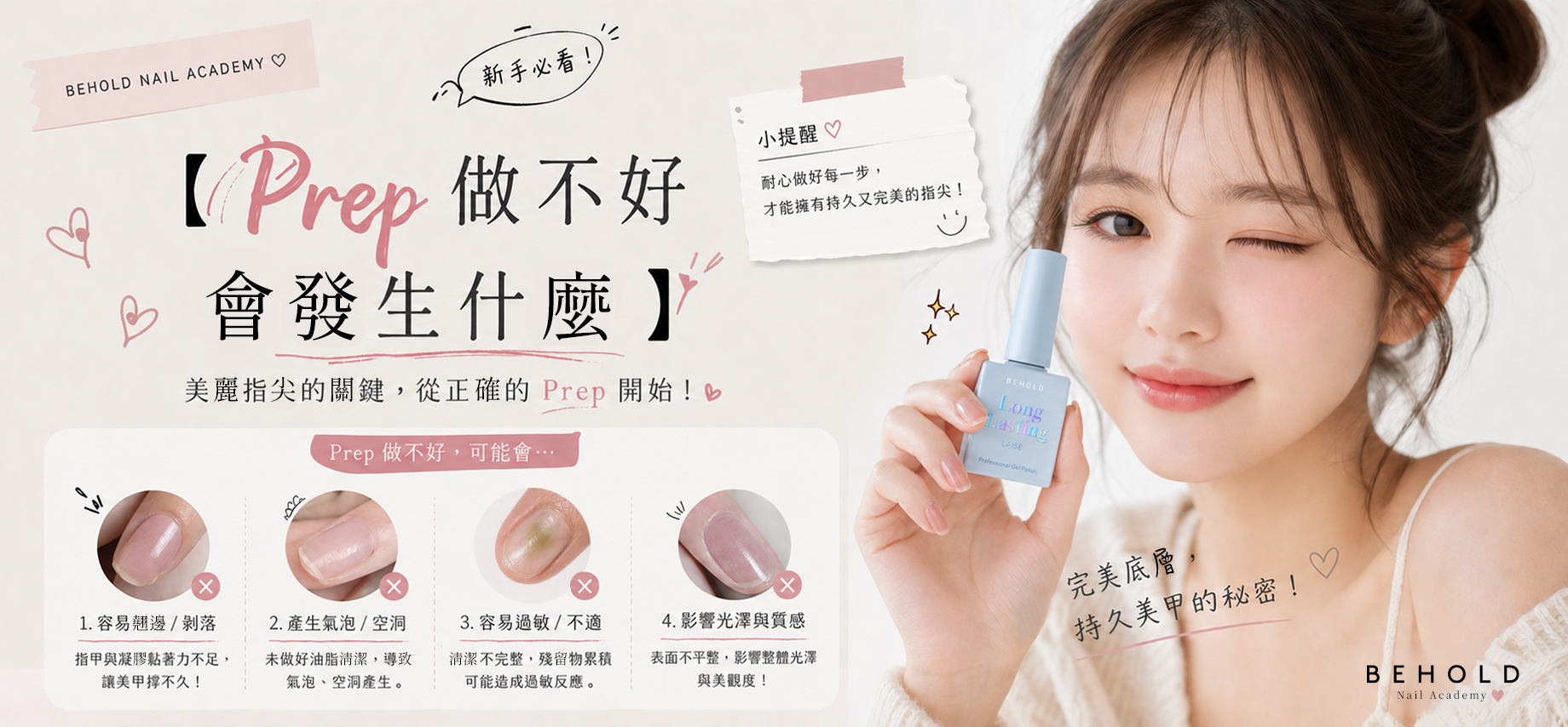 🔍 問題「反正我用好的膠,應該沒關係吧?」——這句話我們聽過太多次了。但現實是:即使用最貴的 gel,prep 做不好,一樣會出問題。💡 原因Nail Prep 是整個做甲過程的地基。地基不穩,上面建再好的樓都會塌。Prep 的質量直接決定了 gel 的附著力、耐久度,和甲面的最終效果。✅ Prep 做不好的 6 個後果❶ 翹邊(最常見) 甲面有油脂或甲皮殘留,Base Coat 無法真正貼住甲板,幾天後從邊緣開始「飛起」。這是 prep 不足最直接的表現。❷ 縮膠 甲面不夠乾燥,膠的附著力弱,照燈時膠受熱收縮,形成縮膠,特別在甲尖和側邊明顯。❸ 甲面有氣泡 甲皮未完全推清,或粉塵未掃走就上膠,氣泡藏在膠層之間,照燈後固化在裡面,影響甲面平滑度。❹ 顏色不均勻 甲面有殘留油脂的地方,色膠無法均勻附著,乾了後出現色差或深淺不一的情況。❺ 甲面容易刮花 Prep 不足導致每層膠固化不全,甲面雖然看起來乾了,但實際上軟,輕輕一刮就有痕跡。❻ 細菌感染風險 最嚴重的後果——Prep 不當引起翹邊後,水分和細菌進入甲縫,長時間積聚會導致甲床發黃、甲床分離,甚至甲溝炎。✅ Prep Checklist——每次做甲前確認□ 雙手洗淨並完全乾透 □ 甲形修整完成 □ 甲皮已推清,無殘留在甲面 □ 多餘死皮已修剪 □ 甲面已用 180 度砂棒磨粗 □ 粉塵已用刷子掃走 □ Dehydrator 已擦拭並完全揮發 □ Primer 已上並完全乾透 □ 甲面呈現均勻啞白色 □ 完成!可以開始上 Base Coat 💬 BEHOLD Tips: 建議把這個 Checklist 截圖存下來,每次做甲前對一次。養成習慣之後,你的甲自然會越做越好、越來越耐用。
